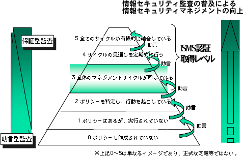 我が国の各組織体における情報セキュリティ対策の現状を鑑みると、当初は、助言型監査が主流となってくると考えられる。監査の際の判断の尺度として提示されるものはベストプラクティスとして示されるものとなるため、保証をしようとしても、このベストプラクティスに照らして「できていない」ことを保証することも可能だが、「できていない」ことの保証を受けることは現実的ではなく、そのようなニーズは極めて少ないと考えられる。また、たとえ保証できたとしても、対象範囲を限定した一部分の保証にならざるを得ないと考えられるからである。
