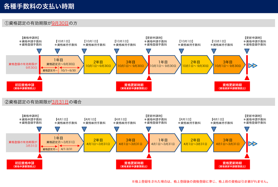 ※資格認定の有効期日が前期(9月30日)の方は毎年10月1日付、後期(3月31日)の方は毎年4月1日付で研修事務局より請求書を郵送いたしますので、所定の振込期限、振込口座へお振込ください。